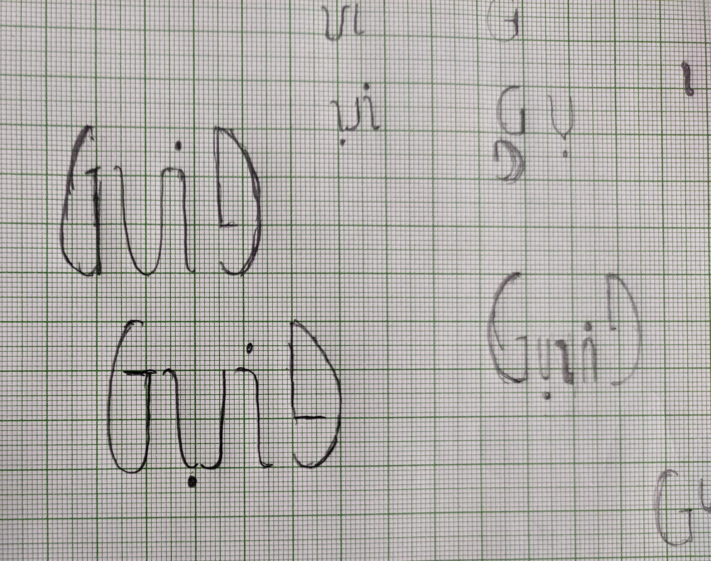 With the ambigrams, I started small. Literally. My mentor suggested I should try drawing instead of writing, which would require me to start sketching out larger forms. Grids helped. As we progressed, they also suggested that I needed constraints. So I was tasked to working on 4 words: guild, pillar, light, and ennui.